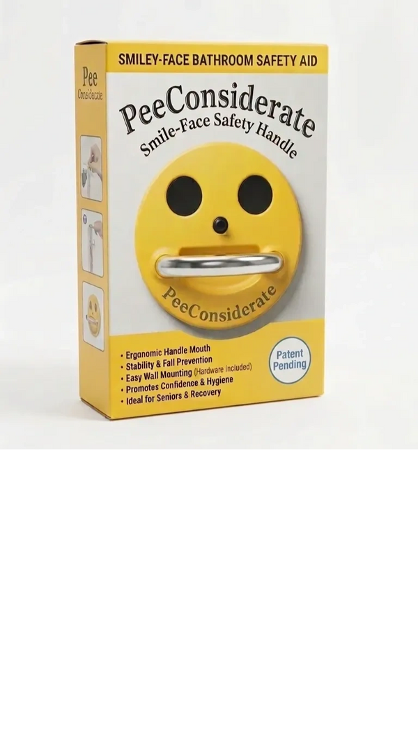 Pee Considerate is a sturdy handle that mounts above your toilet, giving men a secure place to lean in, steady up, and aim straight down. Cleaner walls. Better accuracy. A little more dignity.